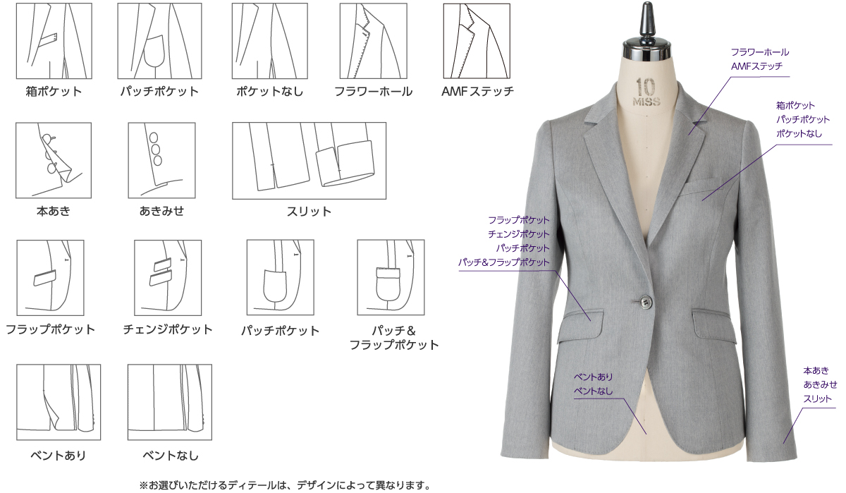 裏地やボタン、袖口仕様などのディテールを選びます。